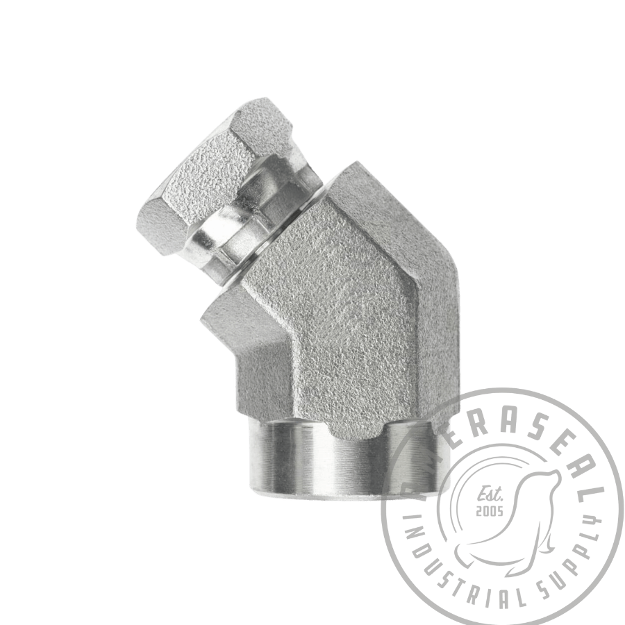 Durable carbon steel 45-degree swivel elbow with female pipe threads on both ends. Designed to allow easy alignment and rotation during installation while providing a reliable directional change for air, water, oil, gas, and general industrial piping applications.