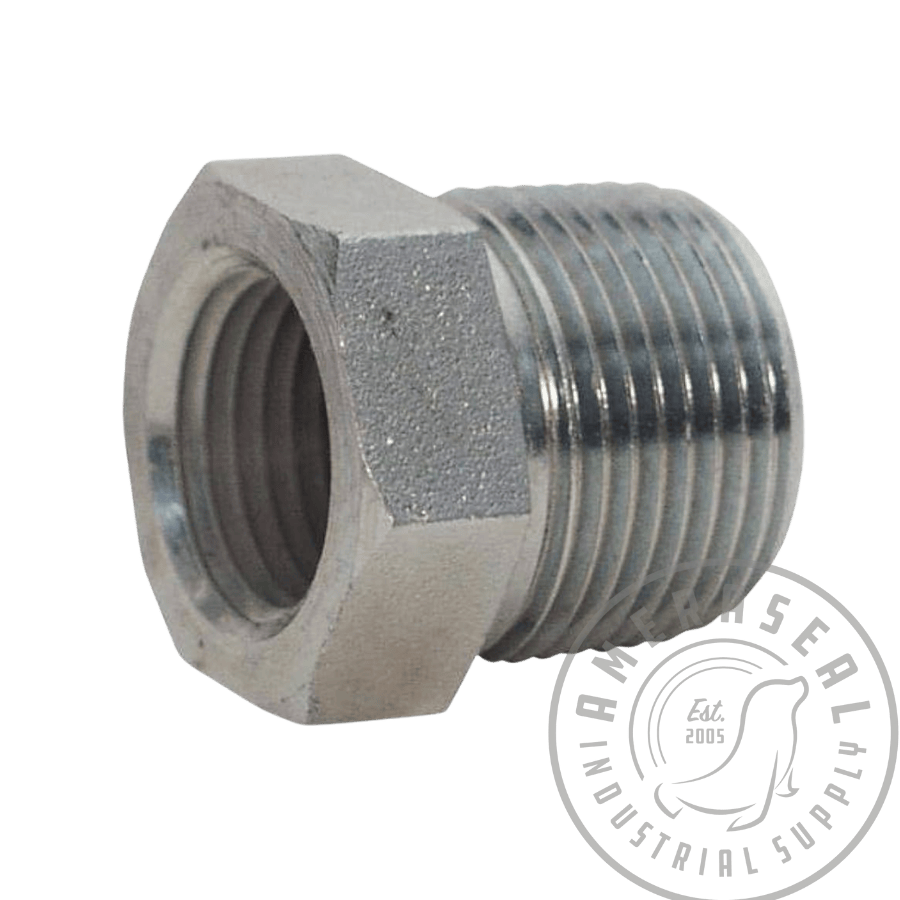 Durable carbon steel reducer bushing for connecting male to female pipe threads. Provides a strong, reliable size transition for air, water, oil, gas, and general industrial piping applications.