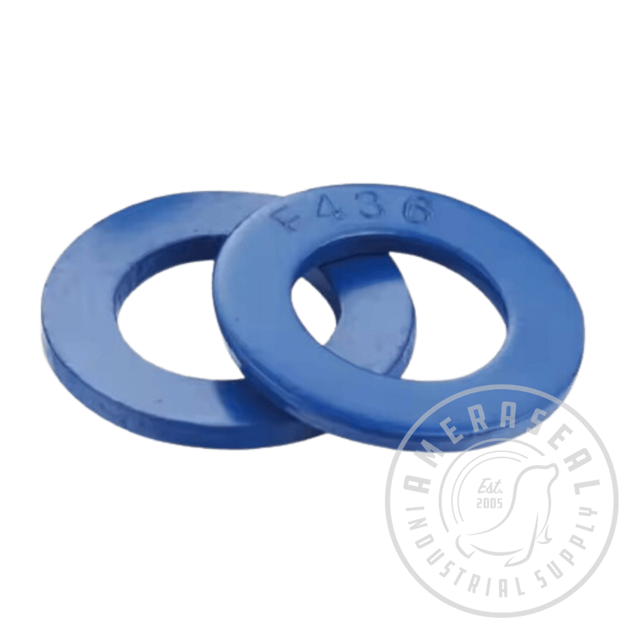 High-strength ASTM F436 hardened steel flat washers with a blue PTFE coating for enhanced corrosion resistance and reduced friction. Designed for structural and high-load bolting applications, these washers provide uniform load distribution under bolt heads and nuts while protecting mating surfaces from wear and galling. Ideal for use in construction, industrial assemblies, and heavy-duty flange or structural connections.