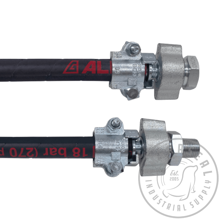 Premade Steam Hose – 50 ft (Male × Female Ends) Heavy-duty 50 ft steam hose assembly designed for safe transfer of high-temperature steam in industrial applications. Equipped with male and female threaded fittings for secure, leak-resistant connections, these assemblies are built for durability, flexibility, and reliable performance in demanding service environments such as refineries, plants, and maintenance operations.
